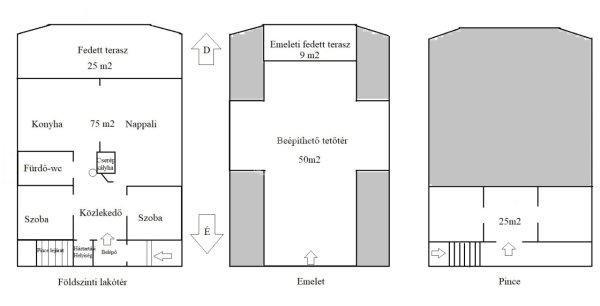 földszintilakórész 75 nm + 25 nm déli tájolású, fedett terasz. Nappali és konyha