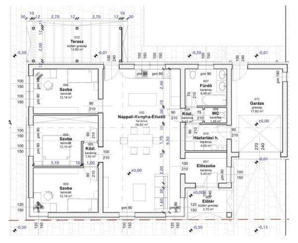 nappali-konyha-étkező,- háztartási helység,- fürdőszoba,- WC,- előtér,- garázs
