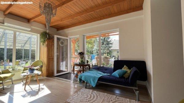 hozzáépített 17 m2-es nappalival, praktikusan 2 fürdűszobával és 18 m2-es