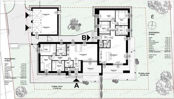 m2 + 14 m2 fedett terasz + 395 m1 kert + 19,5 m2 garázs B. épület :89,5 m2 + 15