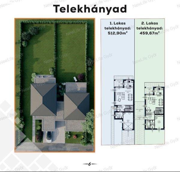 Az ingatlan 989 nm-es telken helyezkedik el, a két szintes lakások külön