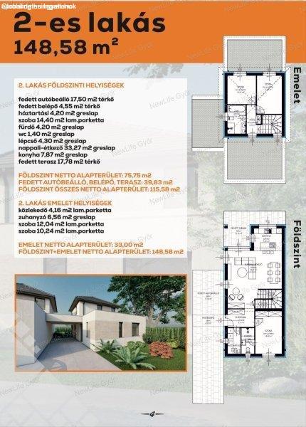 földszint és az emelet nettó alapterülete így 148,58 nm, ebből a hasznos lakótér