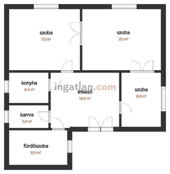 78 m2-es főépületben 3 szoba, étkező, főzőfülke, spejz és fürdőszoba található.