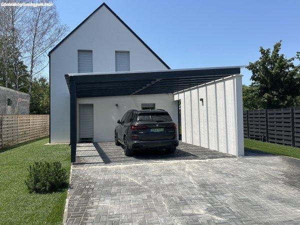 2 autó parkolására alkalmas fedett autóbeállóval, valamint egy 7x3 m-es, 1,5 m