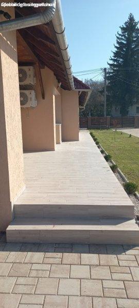 rendezett kertbe lépünk ki, ami részben térkövezett. A házba belépve a tágas