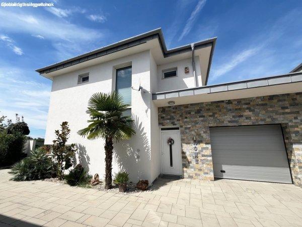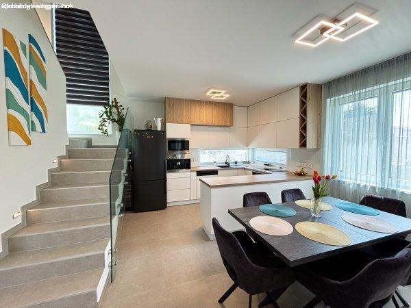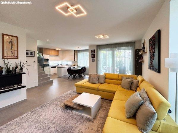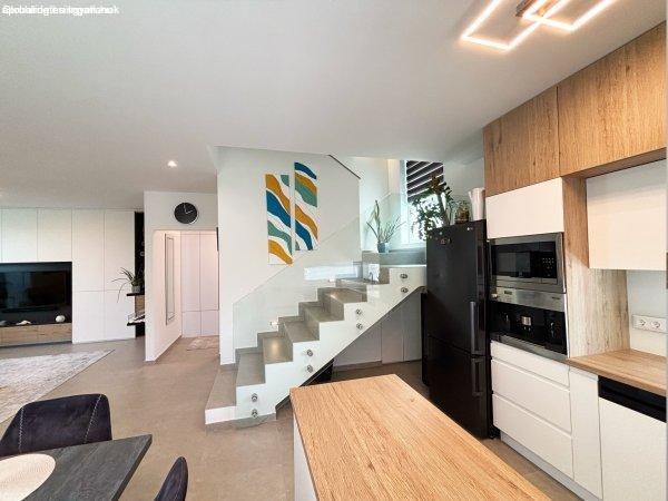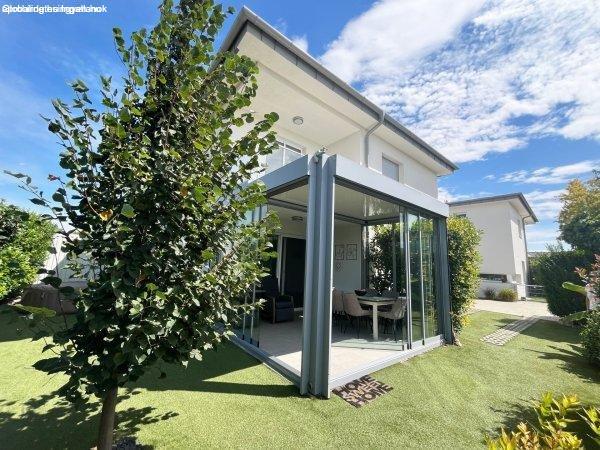 2022 építésű, kétszintes, modern stílusú családi házat, fedett terasszal. Az