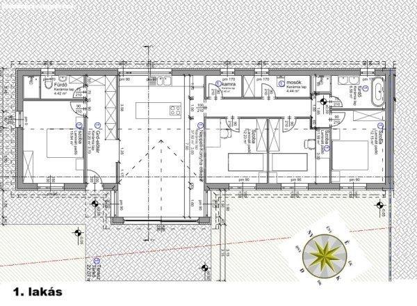 Elrendezés: 4 hálószoba + nappali + 2 fürdő + kamra + háztartási helyiség-