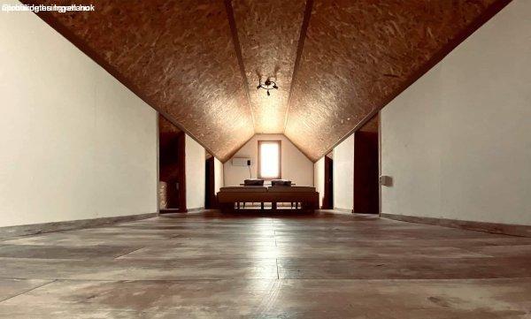 m2 ( +22 m2 tetőtér egy légtérben) ,nappali+2 hálószoba kialakítású,cserépkályha