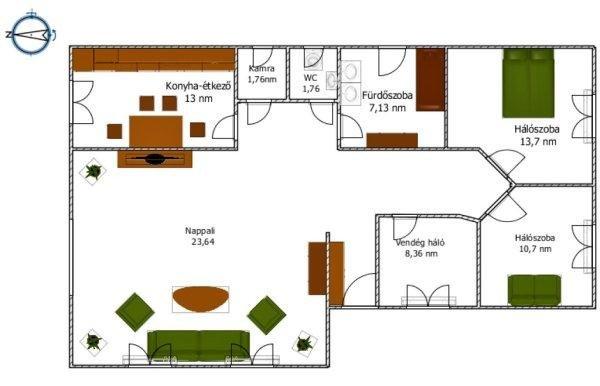 fürdőszoba, WC, háztartási helyiség, 3 hálószoba, közvetlen kertkapcsolatos nagy