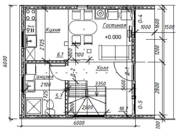 a háznak: 6 méter széles X 7 méter hosszú. Az alsó szinten amerikai konyha