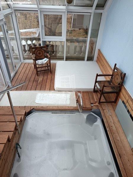 beépített teraszra, téli kert hangulattal bír, fűthető tér, amelyen egy jakuzzi