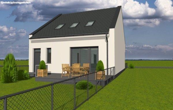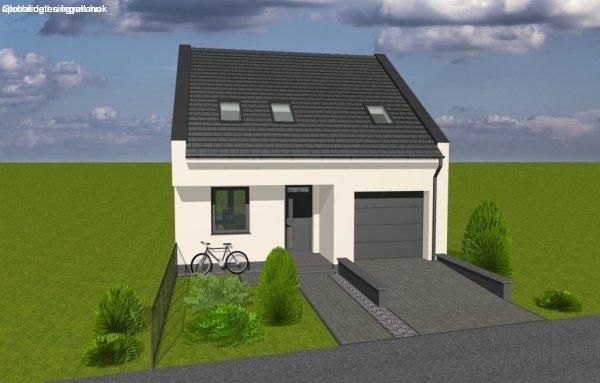 elrendezésű, modern, épülő családi házat, saját kerttel és terasszal.Főbb