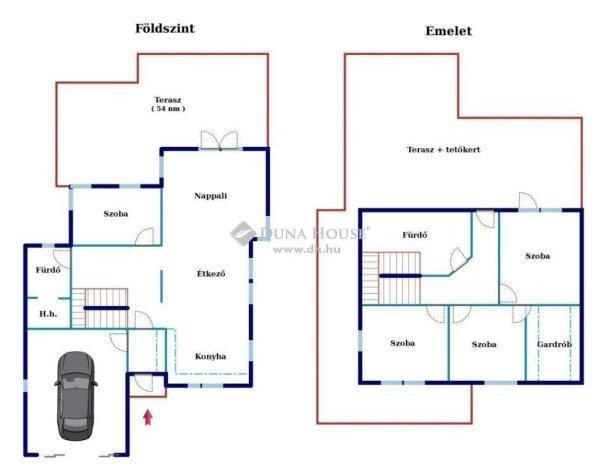 Nappali + 4 szoba + garázs- 54 nm terasz a földszinten- emeleti részen teraszok