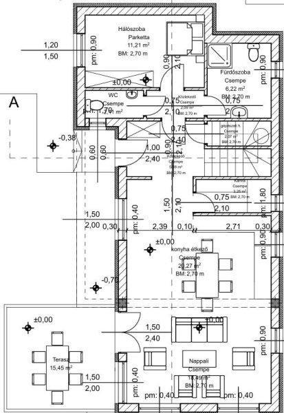 hálószoba(11,2 m2), terasz (15,45 m2).Emeleten: 3 hálószoba (14 m2,14 m2,12 m2),