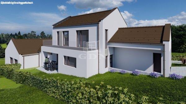 szigeteléssel, vasbeton födémmekel, cserép fedéssel, továbbá dupla garázzsal.Az