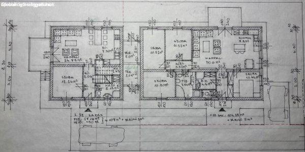 szoba, mosókonyha/fürdő + 5nm tároló + terasz. - Emelet: 3 szoba, közlekedő,