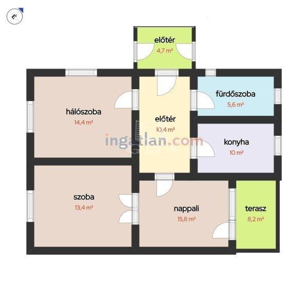 biztosítja.Helyiségek:nappali 15,80m2, szoba 13,41m2, szoba 14,40m2, konyha