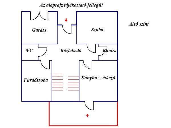 szoba, konyha + étkező, közlekedő, fürdőszoba, kamra, WC, terasz, garázs.Felső