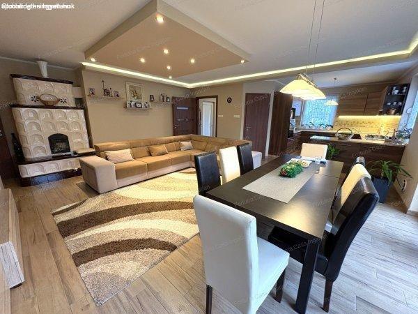 cserépkályha a nappaliban- garázs 18nm- fedett terasz 26 nm- automata kapu-