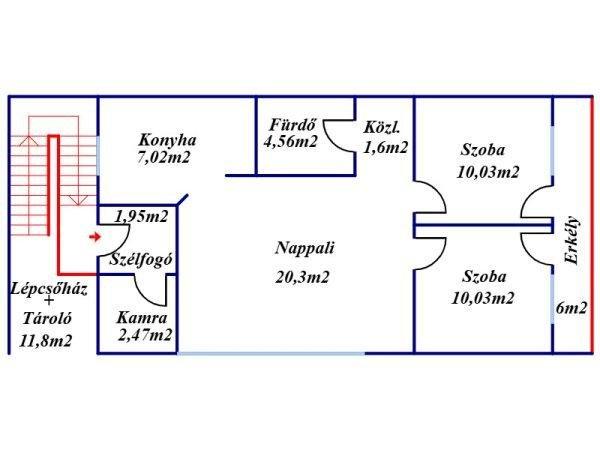 szoba-Nappali-Konyha-Kamra-Fürdőszoba-Közlekedő-Erkély-Lépcsőház és tároló