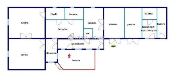 szoba, előszoba, konyha, fürdő, kamra, WC, közlekedő, terasz- központi fűtés