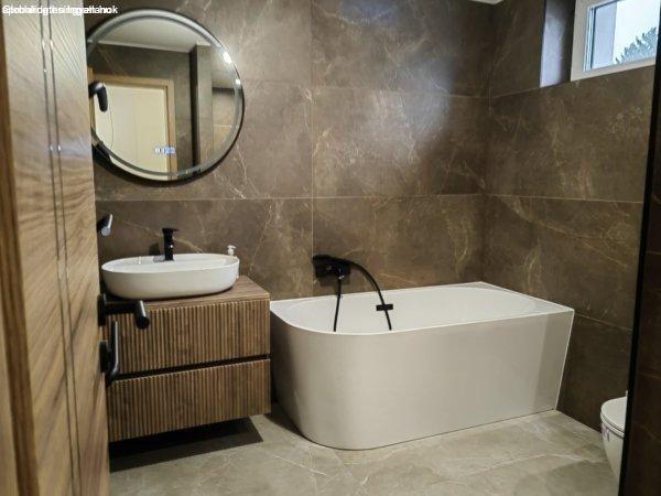 gépekkelLetisztult stílusú, modern fürdőszoba prémium burkolatokkalEgy hálószoba