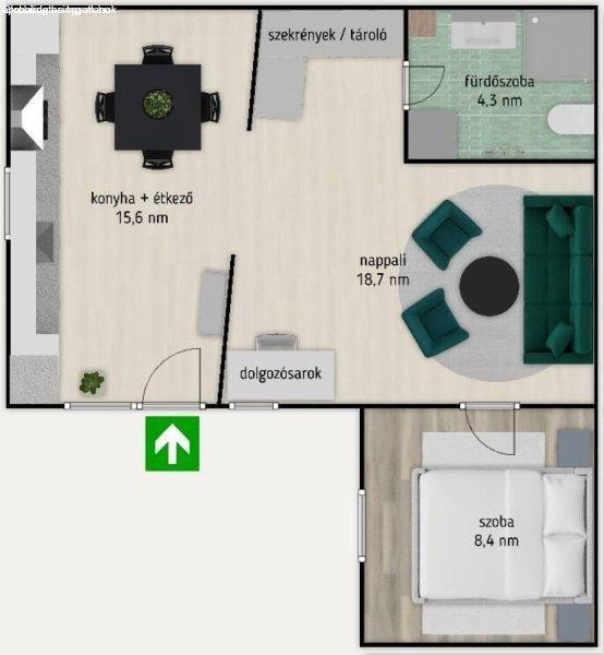 étkező: 15,6 nm- nappali: 18,7 nm- szoba: