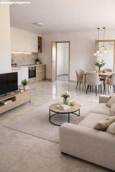 ablakok/ bejárati ajtó. A lakótér burkolatai minőségi, modern, letisztult
