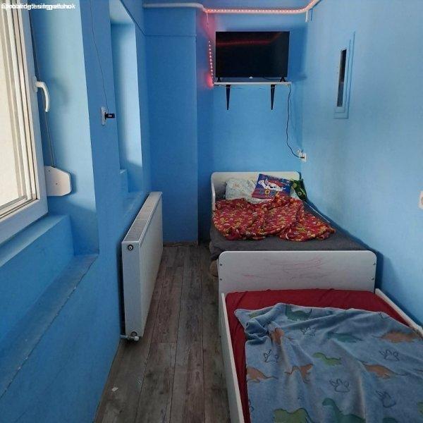ellátást.Lakóterülete 54 m2, melyben előtér, 1 (12 m2) + 2 félszoba (5.2 és 6.6