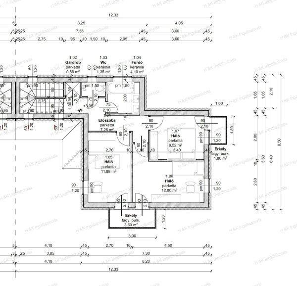 2,52 nm, lépcső 5,5 nm.Emelet: 3 szoba 12,8 ? 11,88 és 9,52 nm, fürdőszoba 4,1