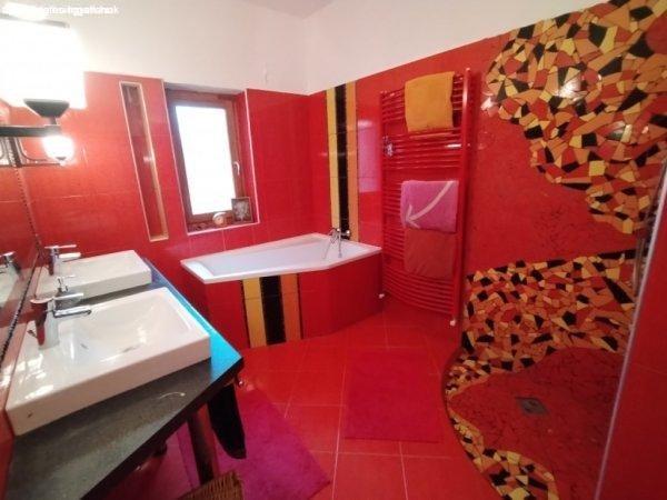 250 m?-es, egyedi stílusban megálmodott, különleges atmoszférájú családi ház. Az