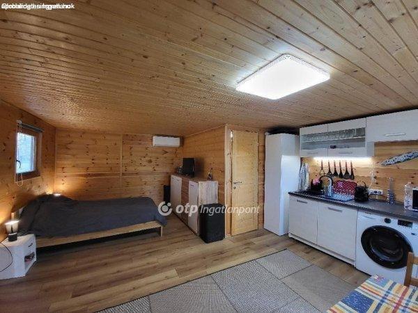 épületben egy légterű konyha nappali háló található, külön helyiségben zuhanyzó