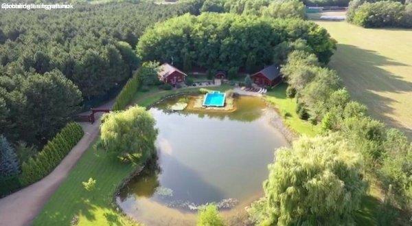 öntözőrendszerrel, kertész által gondozva.- két hangulatos faház a tó partján