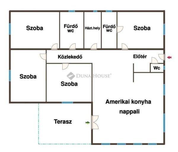 2 fürdőszoba wc-vel- külön wc- előtér, közlekedő- mosókonyha- 16 nm-es nyitott