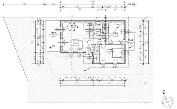 falazatok, cseréptető,- 72 m2-es nettó alapterület + 14,0 és 5,5 m2-es terasz,-