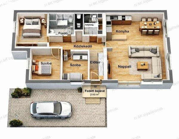 + 20,13 nm terasz + 2,13 nm fedett belépő, amerikai-konyhás nappali + 3 szobás