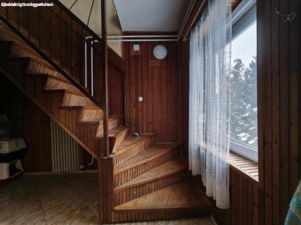 cserép fedéssel hőszigetelt műanyag és hőszigetelt fa nyílászárókkal. Fűtés: gáz