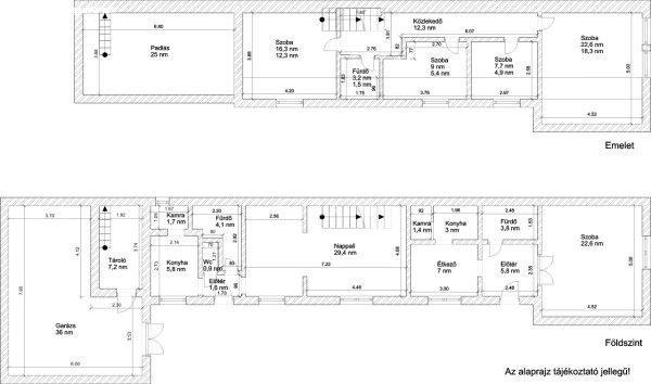 földszint:- előtér 5,8 nm,- étkező 7 nm,-konyha 3 nm,-kamra 1,4 nm,-fürdő 3,8