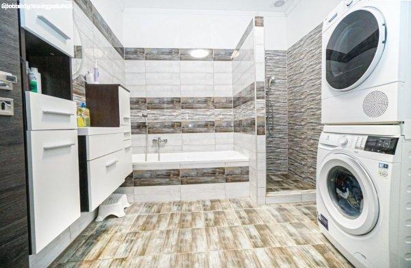 mosogatógép, kerámia főzőlap, páraelszívó- Fürdőszoba zuhanyzóval és káddal
