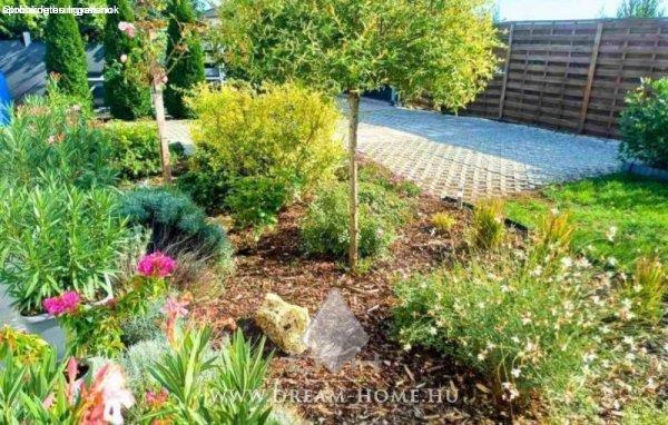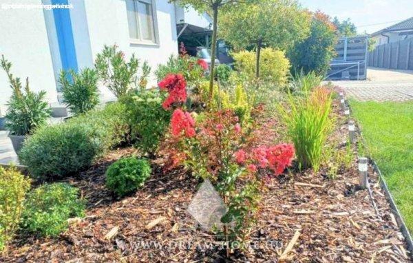 rendezett udvar/kert, térkövezett járda, betonozott bejáró, elektromos kapu és