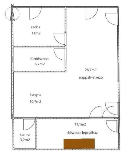 nappali 39,4 nm,- kamra 3,2 nm,- fürdőszoba + WC 6,7 nm,- szoba 11