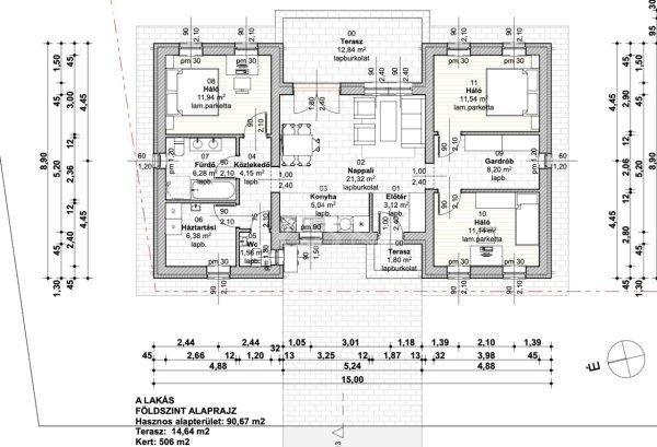 paraméterei:alapterülete: nettó 90,67 nm.beosztása:- előtér 3,12 nm,- nappali