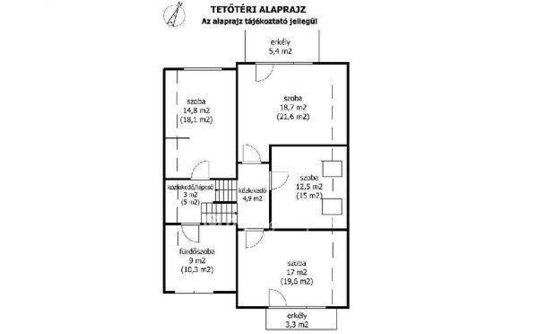 konyha, étkező, 2 fürdőszoba, közlekedők, lépcsők, valamint 2 nagy terasz (17,3