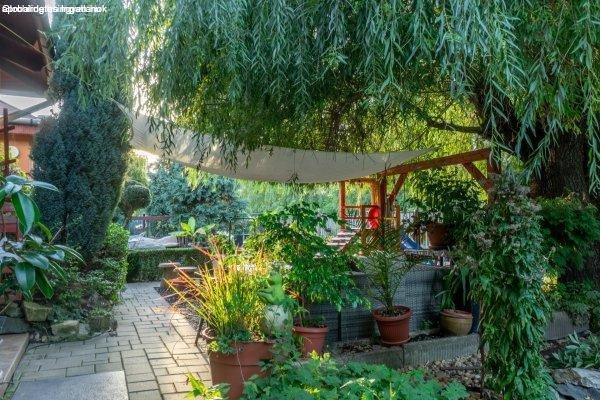 saját halastó híddal, gondozott növényállomány, szalonnasütő és hangulatos
