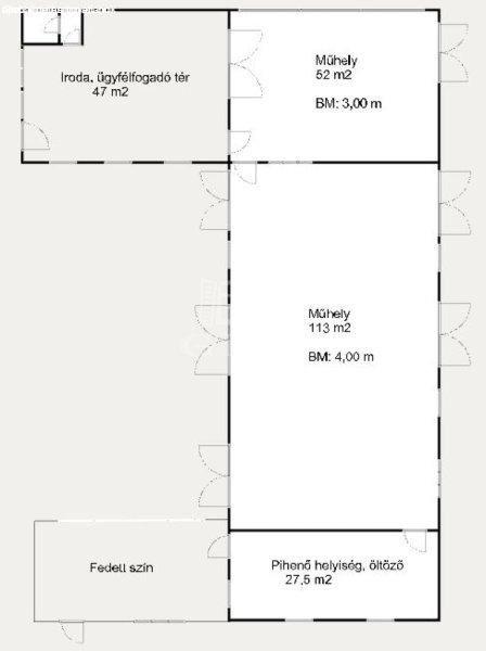méter belmagasságú 113 m2-es műhelyből és egy 27 m2-es pihenő, öltöző részből