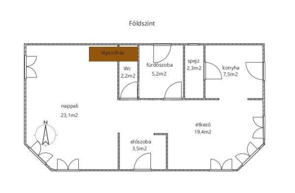 beosztása-földszint:- előszoba 7nm,- nappali 23,1nm,- konyha 7,5nm,- étkező