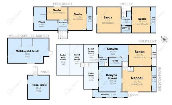 helyet - a magasföldszinten van a főbejárat, ahol a konyha, kijárattal a