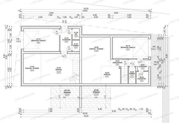 ház kb. 430 nm-es telekrészre épül, a lakások területe megegyezik, de a belső