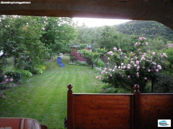 lejtős, szépen parkosított. A kertben 2 db faház van ahol a kerti eszközök